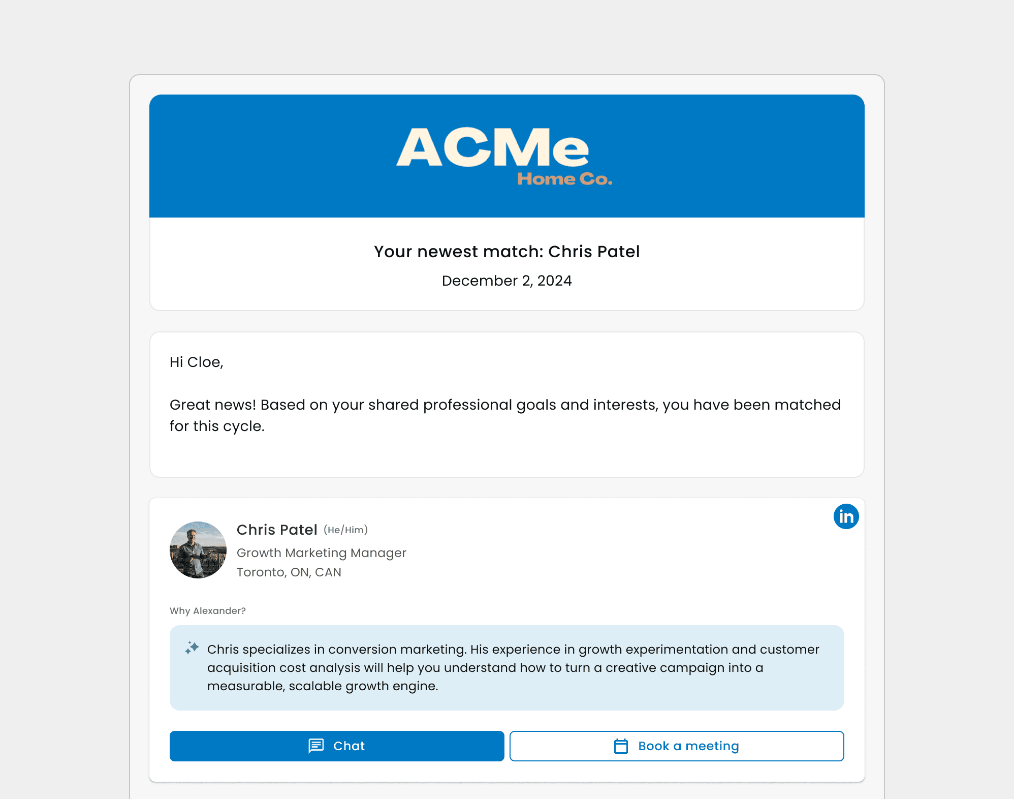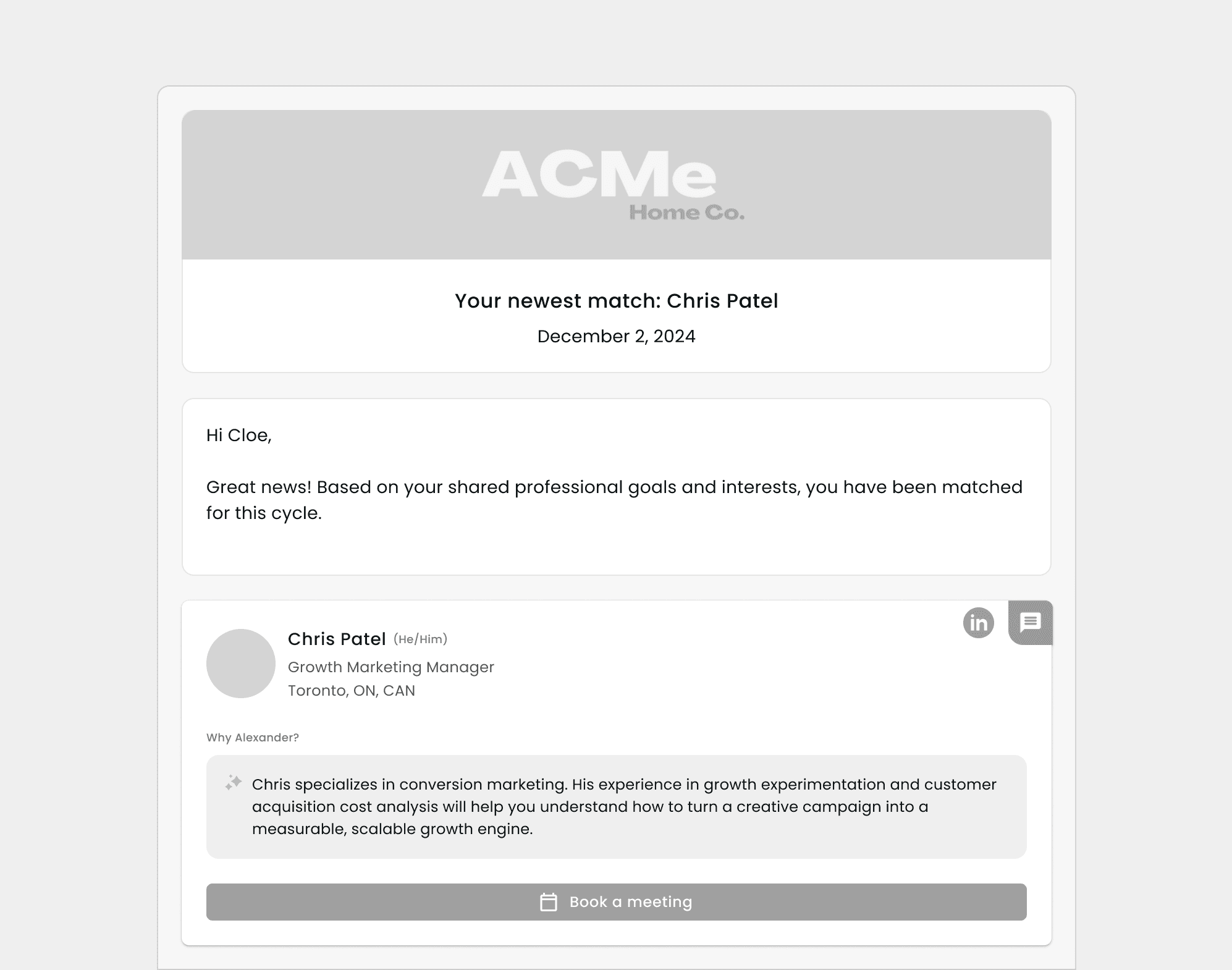 When people were matched together, the main CTA button on the email was "Book a meeting." Users felt awkward about booking time in someone's calendar without chatting with them first.