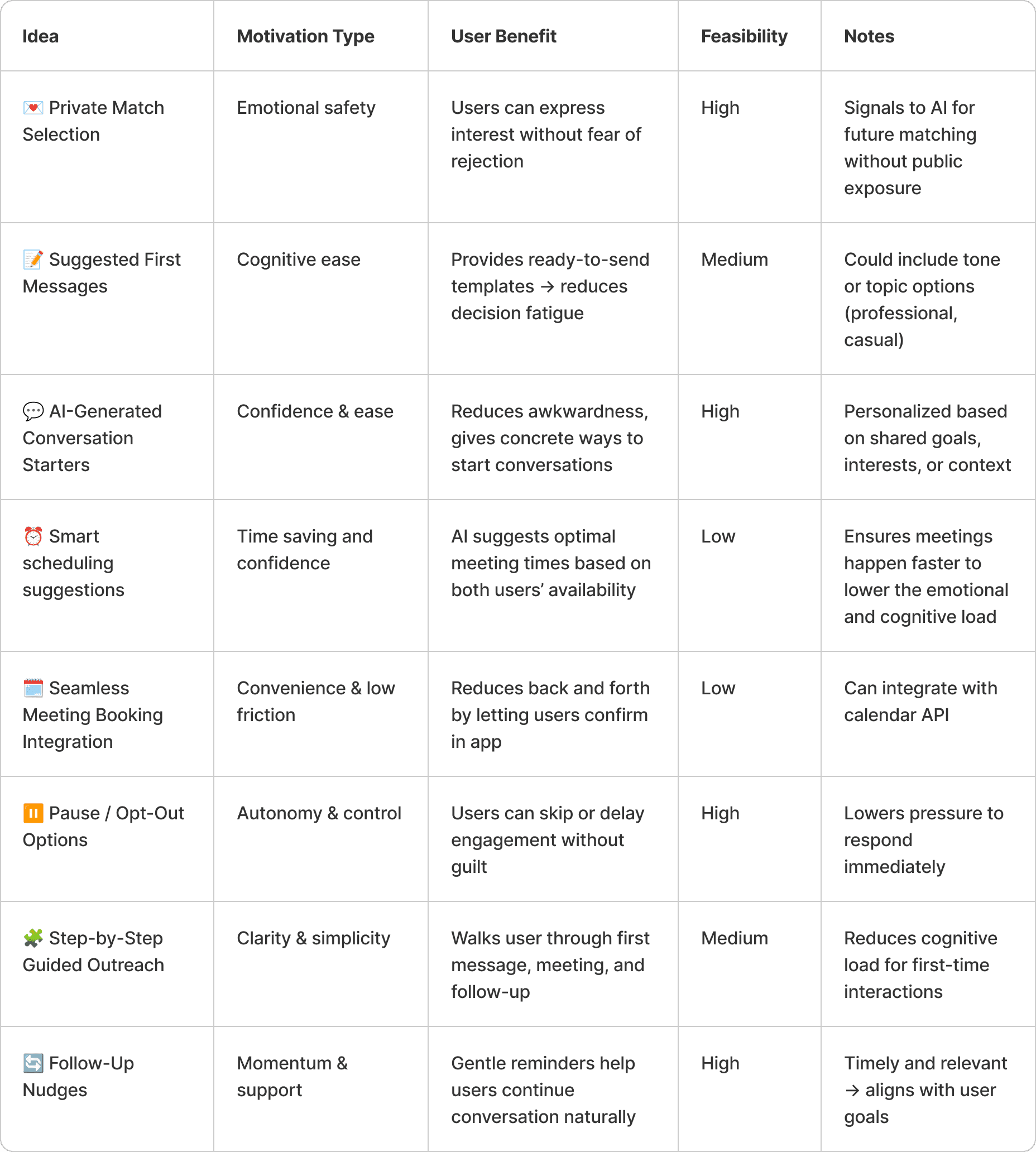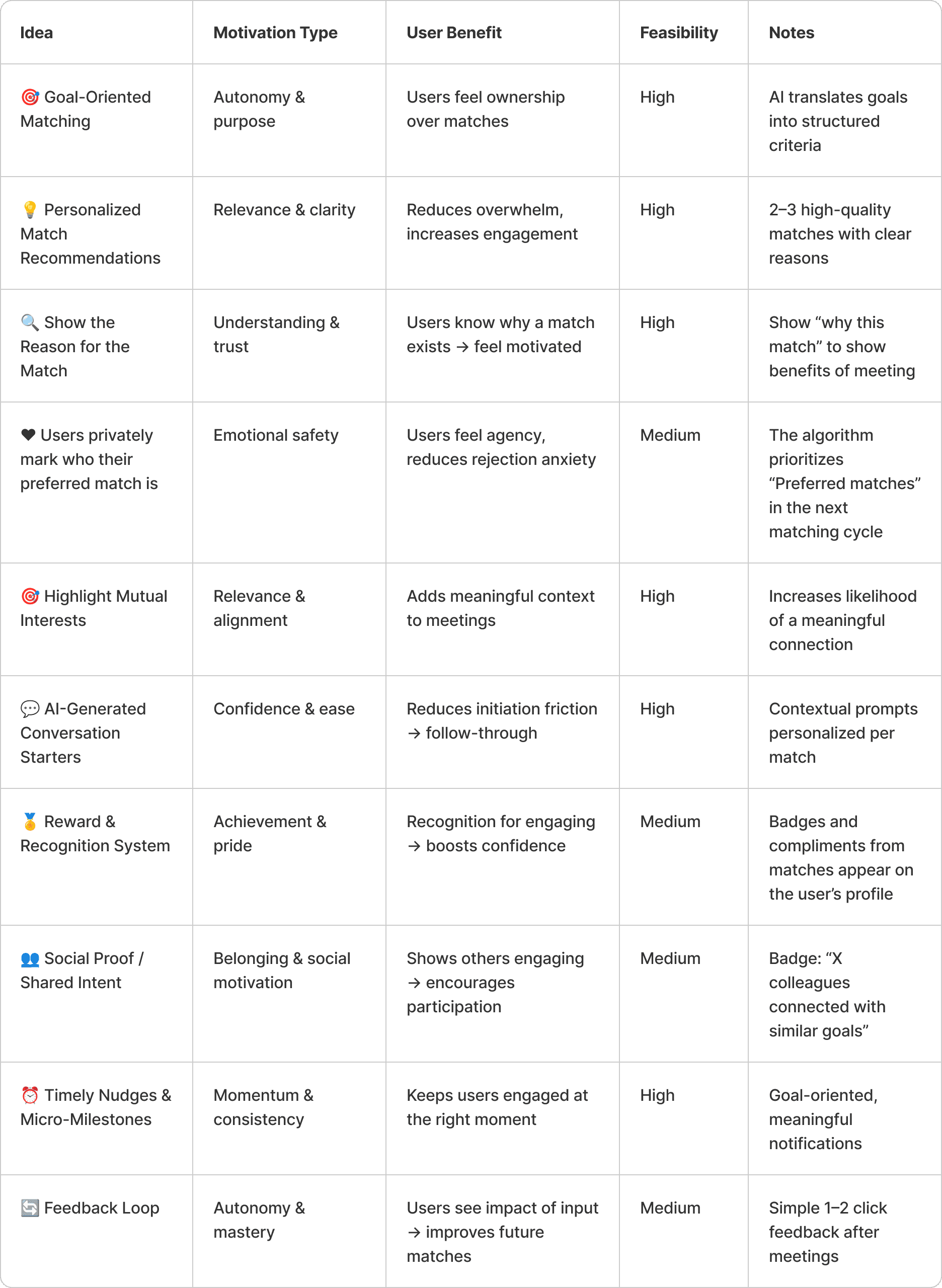 AI generates personalized conversation starters using shared context, goals, and profile data. By reducing the emotional effort required to initiate contact, users are more likely to reach out with confidence and follow through on meaningful conversations.